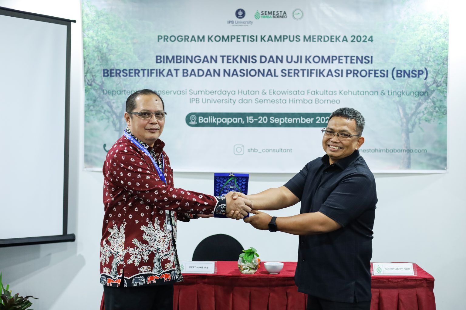 Pada tanggal 15-20 September 2024 telah dilaksanakan Bimbingan Teknis dan Uji Kompetensi Bersertifikasi BNSP yang berlokasi di Platinum Hotel, Balikpapan, Kalimantan Timur. Kegiatan ini merupakan kerjasama dengan Departemen Konservasi Sumber Daya Hutan dan Ekowisata, Fakultas Kehutanan dan Lingkungan, IPB University. Bimbingan teknis dibuka langsung oleh Direktur Utama PT. Semesta Himba Borneo dan Perwakilan Departemen Konservasi Sumber Daya Hutan dan Ekowisata, Fakultas Kehutanan dan Lingkungan, IPB University. Peserta sebanyak 11 orang yang merupakan Dosen dari Departemen KSHE, Fakultas Kehutanan dan Lingkungan, IPB University.