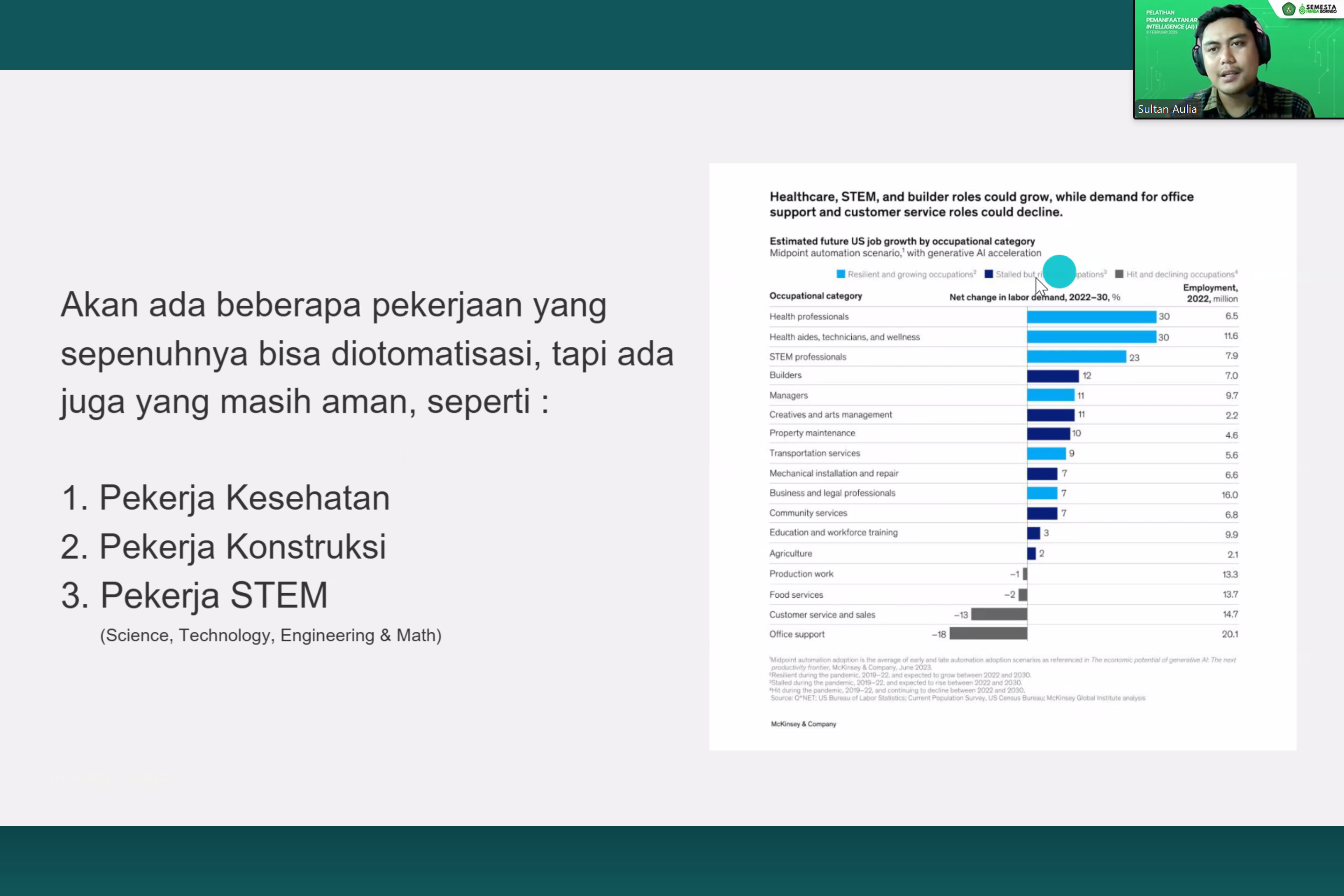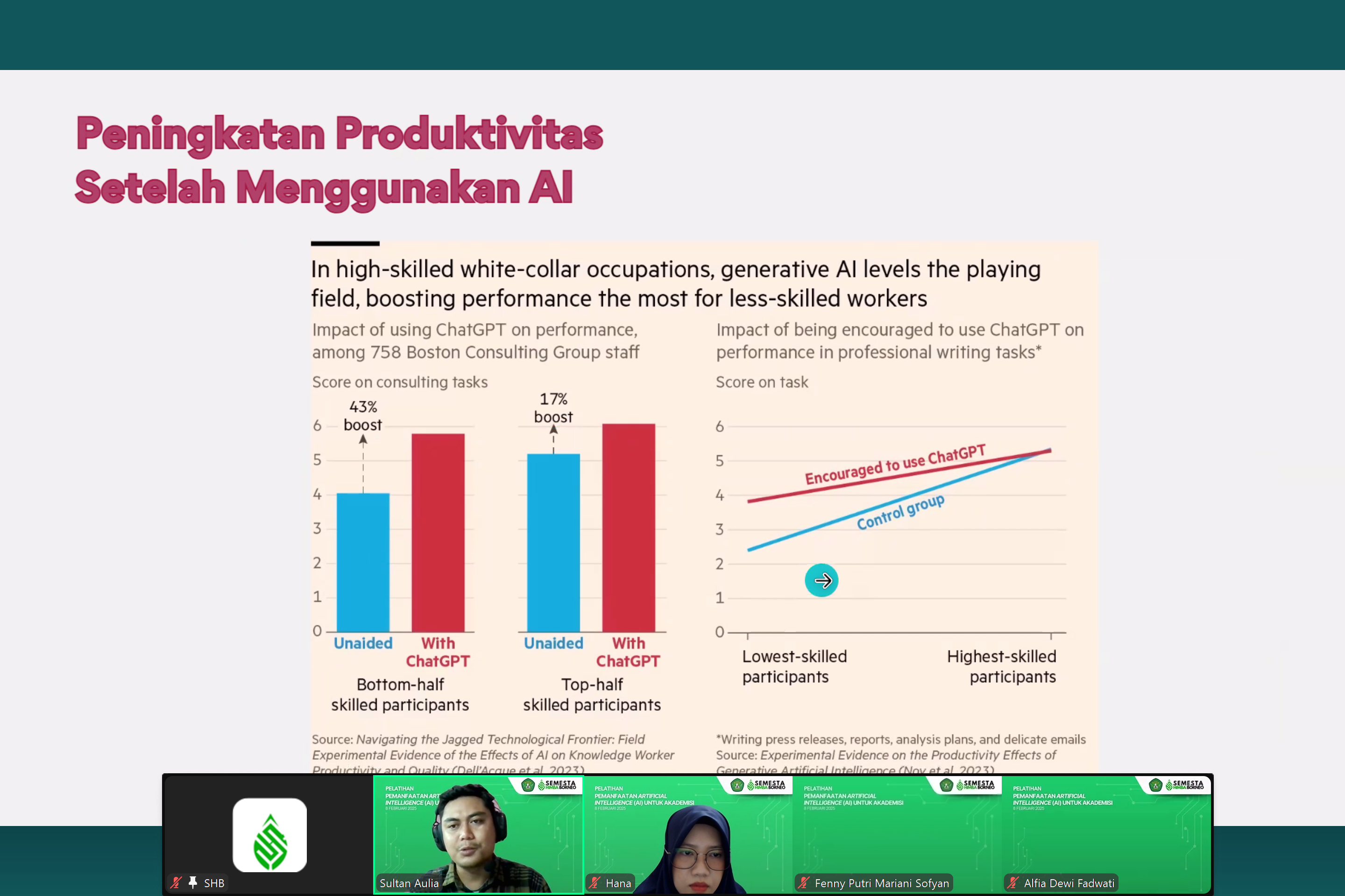 Dalam upaya meningkatkan kapasitas sumber daya manusia di bidang pendidikan dan riset berbasis teknologi, PT. Semesta Himba Borneo menyelenggarakan kegiatan Webinar Pemanfaatan Artificial Intelligence (AI) untuk Akademisi pada tanggal 08 Februari 2025. Kegiatan ini dilaksanakan secara virtual melalui platform Zoom dan diikuti oleh lebih dari 50 peserta yang berasal dari kalangan dosen, peneliti, serta mahasiswa tingkat akhir dari Universitas Mulawarman Samarinda, Kalimantan Timur. Webinar ini secara resmi dibuka oleh Direktur Utama PT. Semesta Himba Borneo, Irsan Supratman, S.Hut, yang menegaskan pentingnya adaptasi dunia akademik terhadap perkembangan teknologi kecerdasan buatan dalam menunjang efektivitas pembelajaran dan inovasi riset.